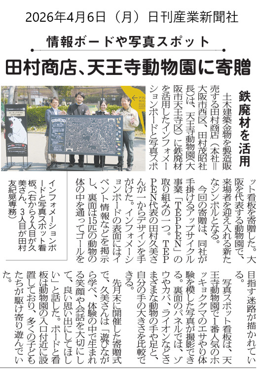 日刊産業新聞社 様に 天王寺動物園へのインフォメーションボード、フォトスポット看板の寄贈の記事を掲載いただきました。